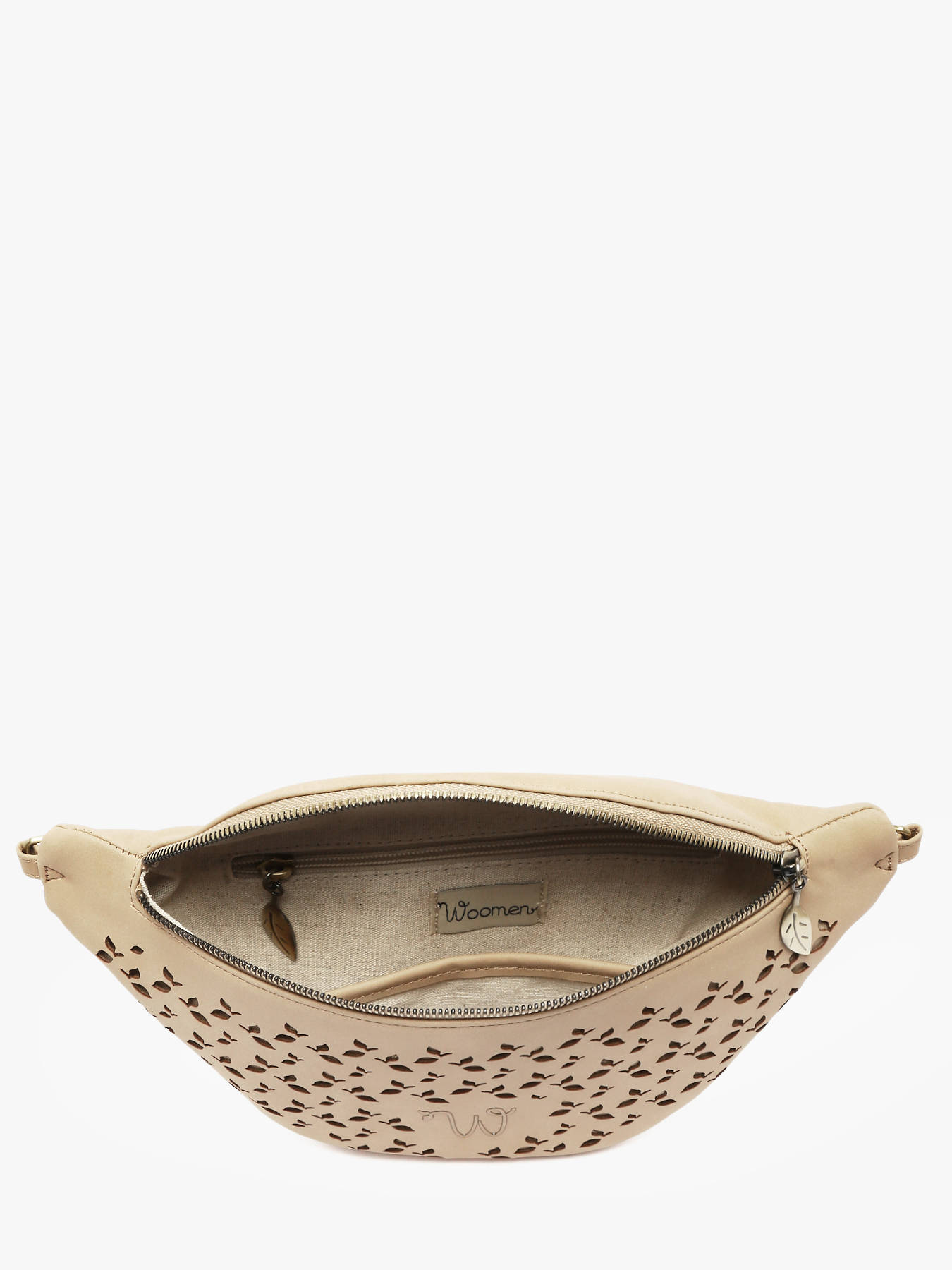 The WOOMEN Zamia belt bag combines style, practicality, and sustainable design. Its main material, polyurethane made from 58% recycled materials with a cotton and linen lining, ensures both lightness and durability. The perforated leaf-patterned material adds originality and sophistication to the model. Compact and practical, this belt bag features a zip pocket and a slip pocket inside for easy organization of your essentials. Adorned with the gold-tone resin logo, it is an elegant and functional accessory, perfect for your everyday outfits.