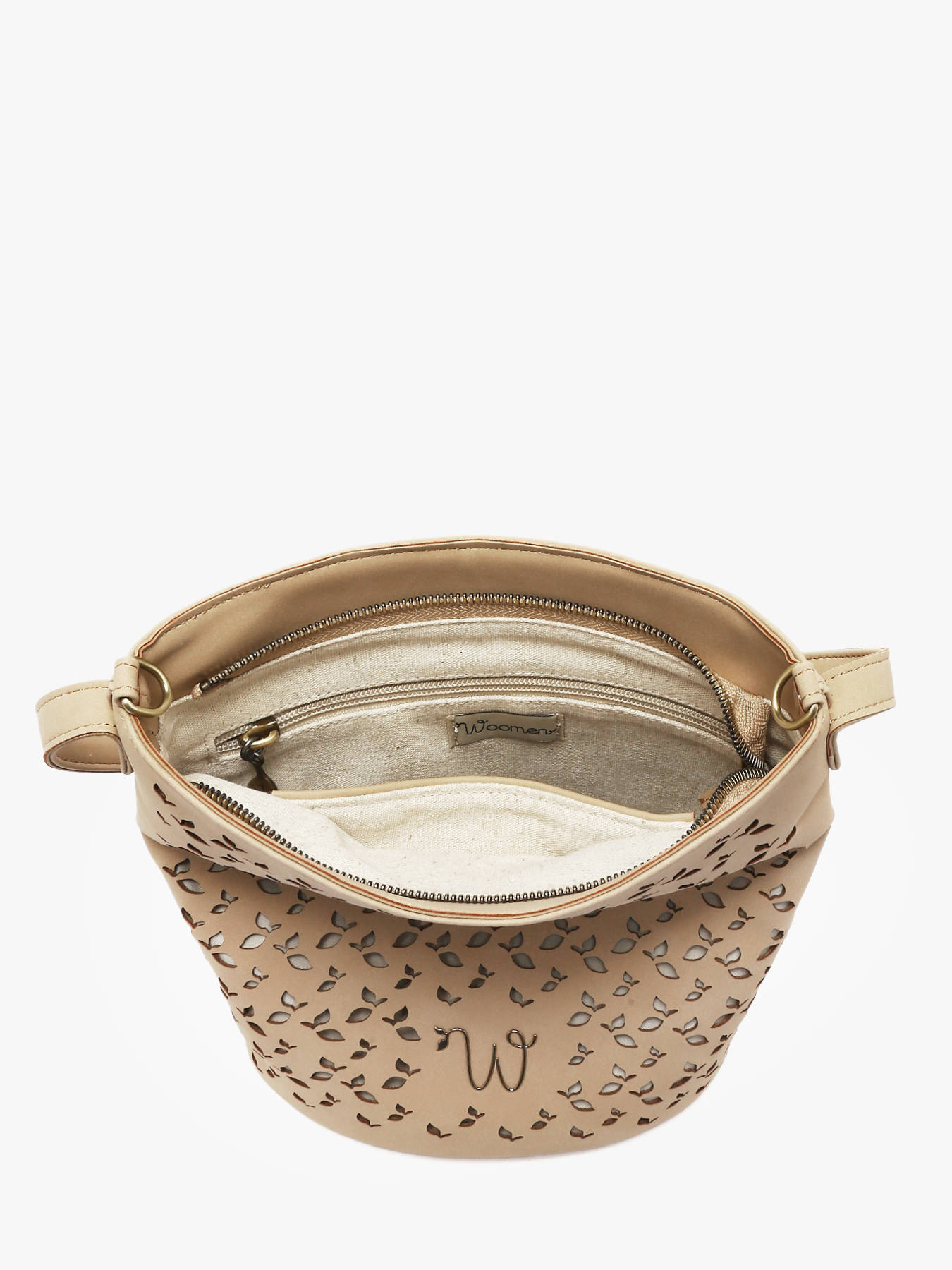 The WOOMEN Zamia crossbody bag combines elegance, functionality, and sustainable design. Its main material, polyurethane made from 58% recycled materials with a cotton and linen lining, ensures both lightness and durability. The perforated leaf-patterned material adds originality and sophistication to the model. This bucket-style bag features a removable shoulder strap, a small handle for hand carrying, and closes with a hidden magnetic snap. Inside, a zip pocket and a slip pocket make it easy to organize your essentials. The gold-tone resin logo completes the design, making this bag a practical and stylish accessory for any outfit.