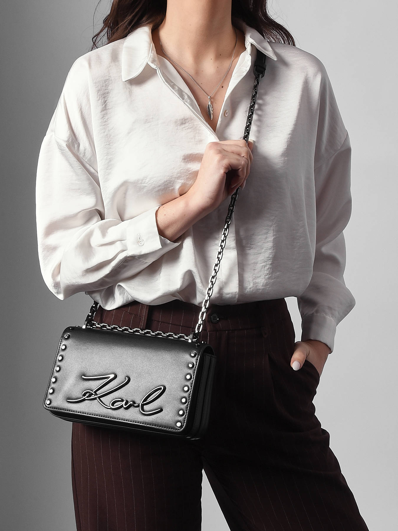 The K SIGNATURE Karl Lagerfeld crossbody bag, crafted from high-quality cowhide leather, combines timeless elegance with functionality. Its smooth, refined exterior closes with a flap secured by a magnetic clasp, ensuring protection for your belongings while providing easy access to the main compartment. Designed for crossbody wear, this bag offers optimal comfort and freedom of movement while adding a chic and modern touch to your outfits. The interior features a spacious compartment complemented by a simple pocket, perfect for organizing your essentials with ease. Compact and practical, this model perfectly reflects Karl Lagerfeld’s sophisticated and contemporary aesthetic, making it a versatile and elegant accessory for all occasions, from office to outings.