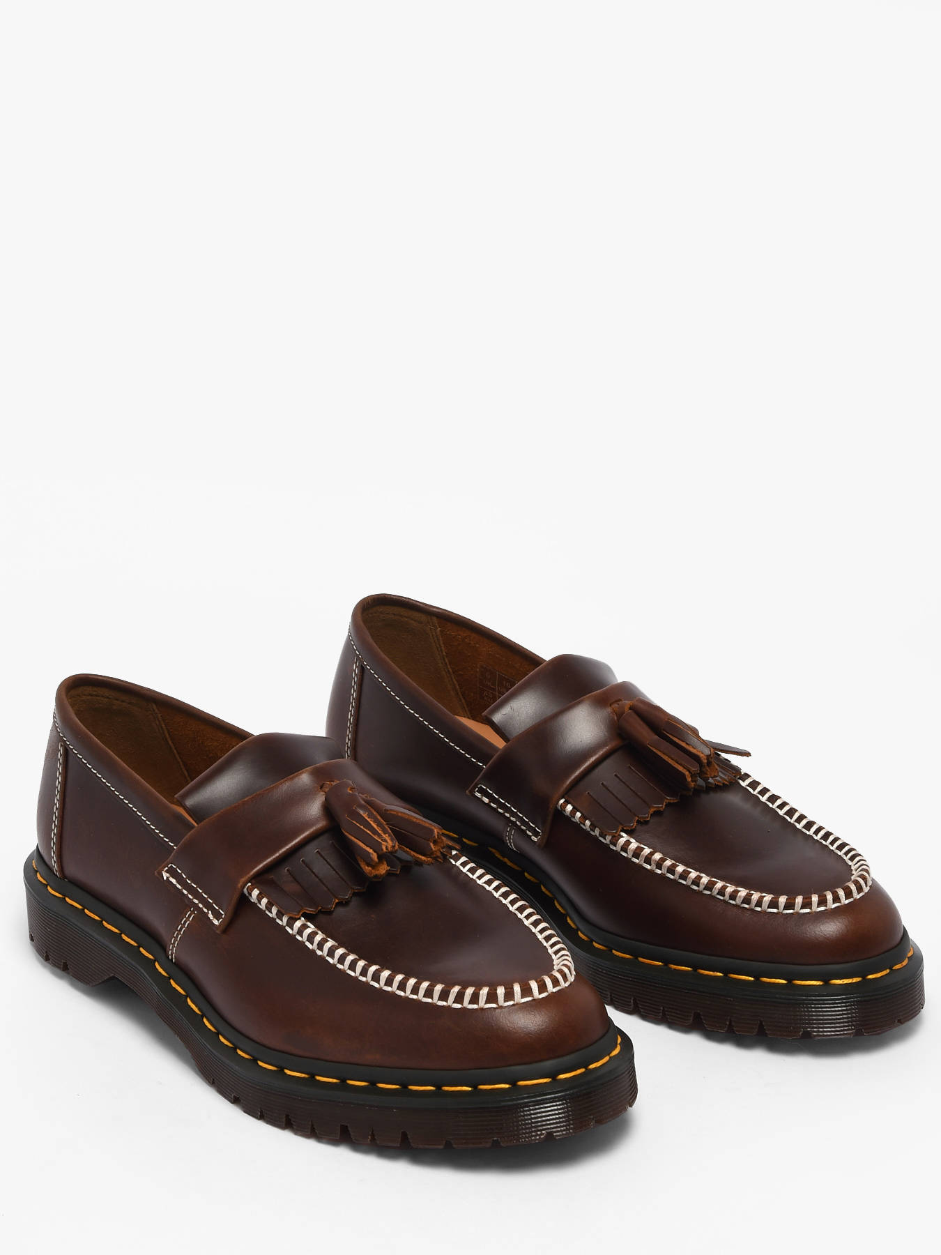 The Adrian tassel loafers from Dr Martens for men in brown Orleans leather combine elegance and character with the brand’s iconic signature. Their deep leather with a soft waxed finish subtly develops a patina over time, revealing a unique style, while the double tassels, fringe panel, and contrasting stitching add refined details that strengthen the model’s identity. The chunky notched sole, highlighted with yellow stitching and a two-tone ridged welt, ensures durability, comfort, and instant recognizability. Versatile and timeless, these loafers are a must-have to carry the day with style, confidence, and character, showcasing a modern, elegant, and unmistakably Dr Martens look.