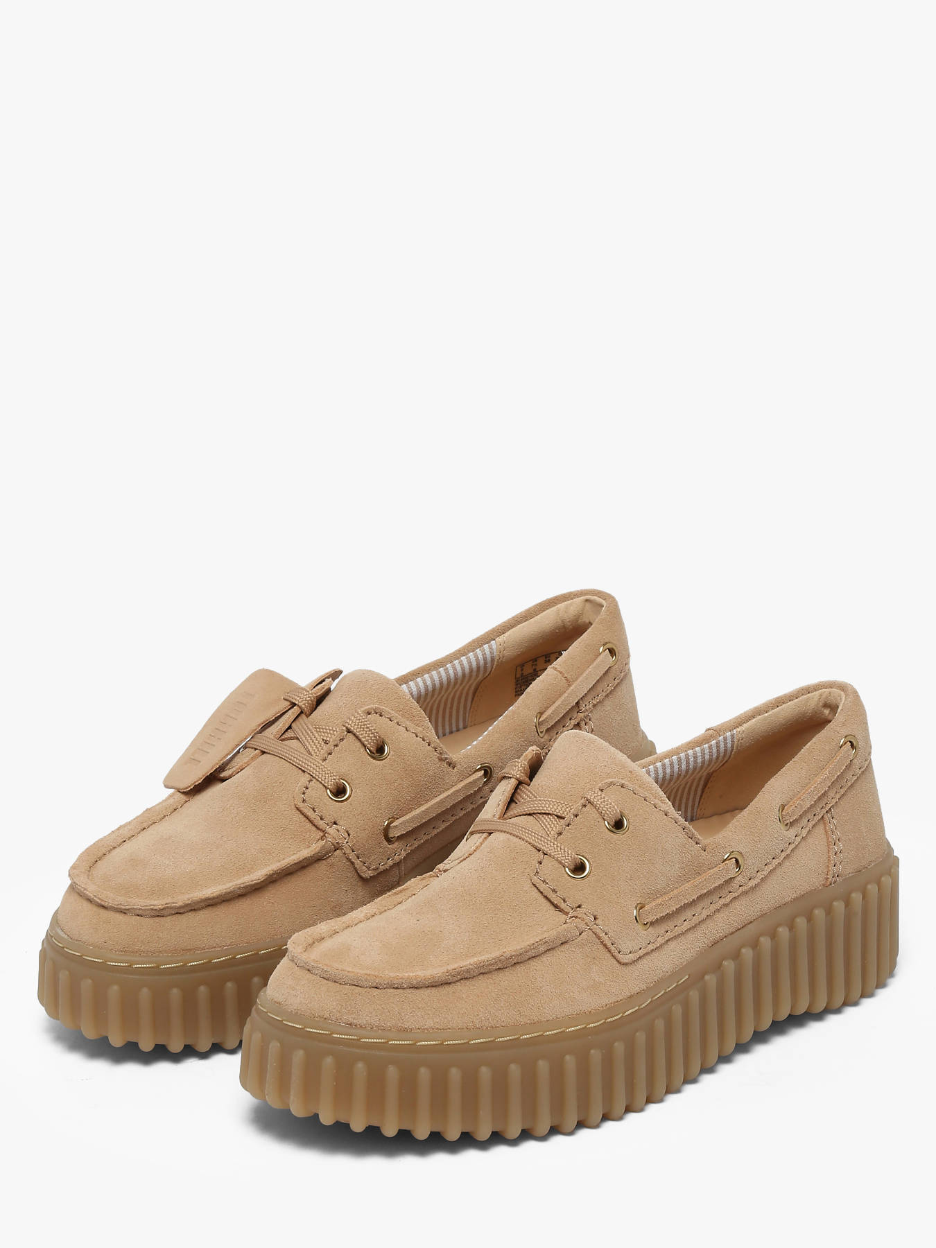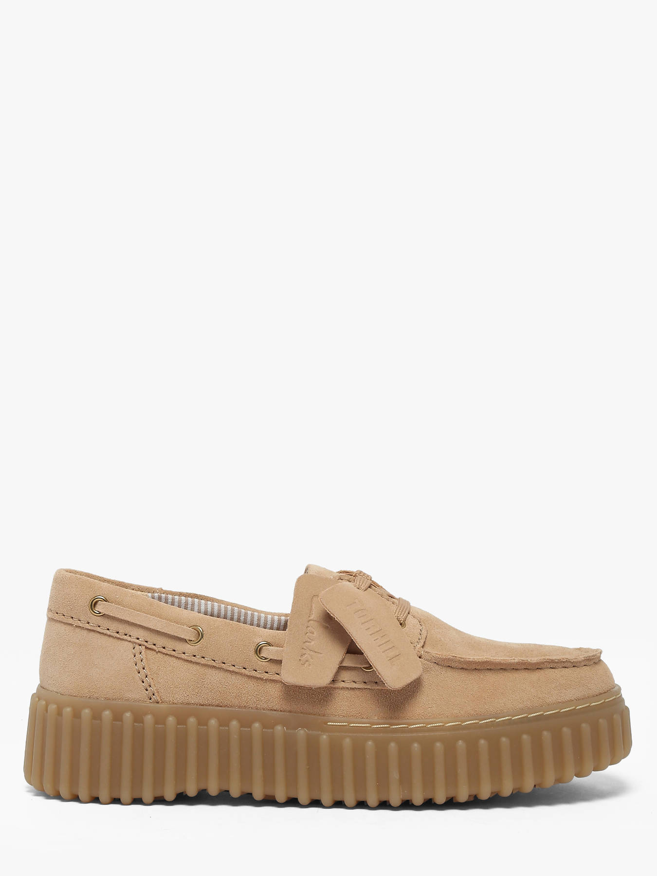 The Torhill Boat women’s shoes by Clarks in beige suede reinvent a timeless classic with a fresh summer twist. Inspired by iconic boat shoes, they feature the distinctive Torhill signature with a bold ribbed outsole drawn from the brand’s archives. Their refined silhouette is enhanced by soft, light beige suede that pairs effortlessly with any summer outfit. Inside, a leather insole delivers exceptional comfort for everyday wear. A suede fob embossed with the Torhill logo completes the design, highlighting its authentic character and rich heritage. The Torhill Boat is the perfect choice to combine relaxed elegance, comfort, and style throughout the season.