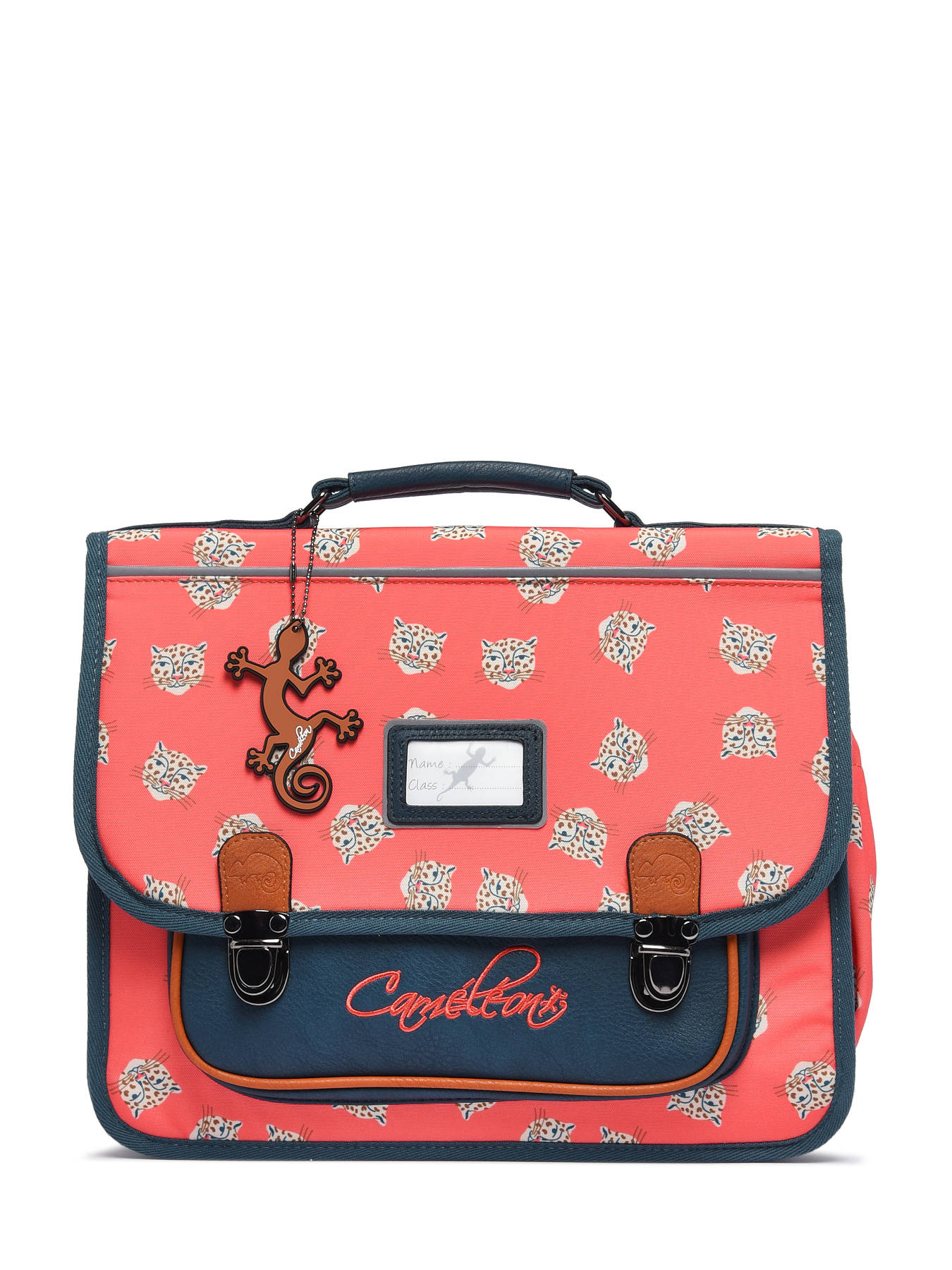 35 cm - 13 liters - 0.89 kg ~ We present you this Caméléon two compartment schoolbag for its multiple strong points: its polyester material (naturally water resistant), its modern and timeless lines, its timeless colors, the nicely drawn dog heads and especially for all its other advantages: its resistant handle and straps, its solid closures, its various interior storage compartments and its reflective strips. Finally, you should know that the ergonomics of the Cameleon schoolbags are designed for the well-being of your child.