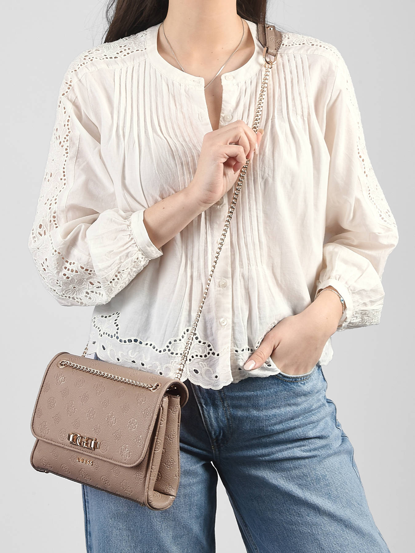 The ANISE GUESS crossbody bag in P.U combines elegance and functionality for a chic everyday look. Its smooth, structured exterior features a back pocket for easy access to essentials, while the flap with magnetic closure provides security and convenience. Designed for crossbody wear, it offers a modern, versatile style, perfect for urban outings. Inside, two compartments help organize your belongings, complemented by a zip pocket for valuables and three card slots, making it easy to access essentials while keeping personal items neatly stored. Lightweight and refined, this bag is perfect for both day and evening outfits. Its minimalist design and P.U finish add a sophisticated, contemporary touch, making it a stylish and practical accessory that balances aesthetics and organization.