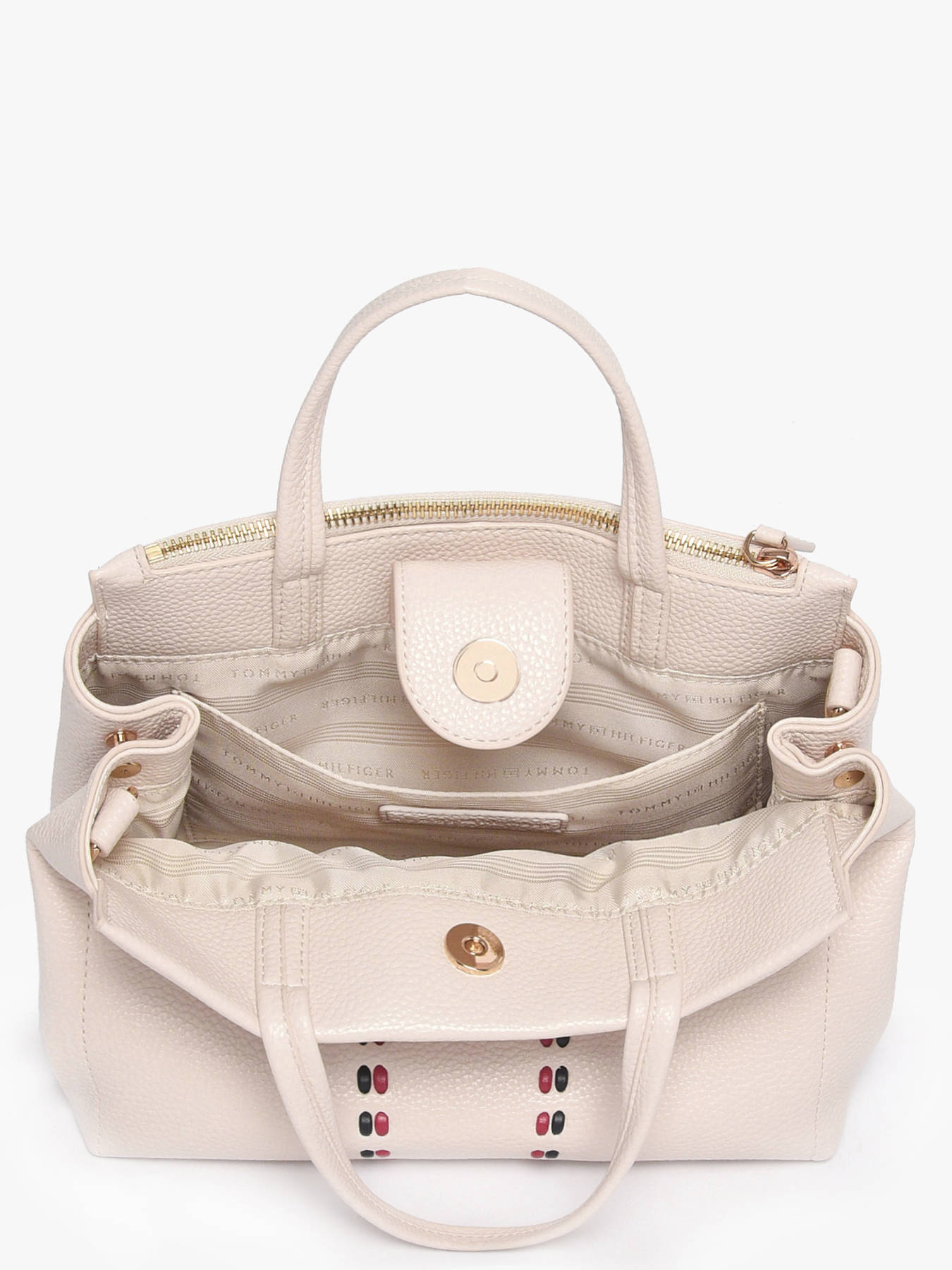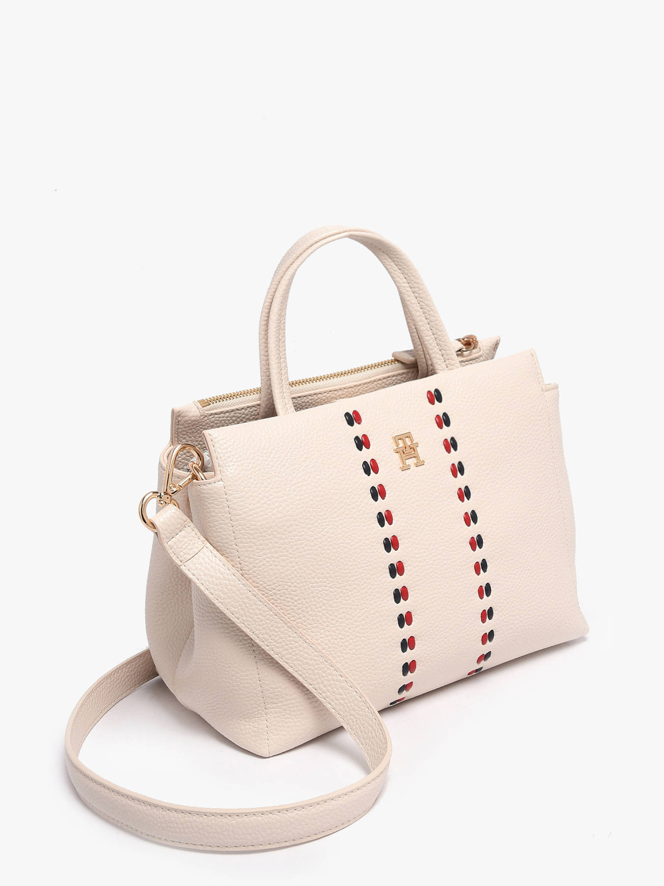 The Timeless handbag by Tommy Hilfiger, made from recycled P.E.T, combines modern style with eco-conscious commitment. Its sleek exterior features a dual zip and magnetic closure for optimal security. The 10 cm handle allows refined hand carrying, while the adjustable and removable strap offers the convenience of crossbody wear. Inside, the bag includes two spacious compartments and one simple pocket, ideal for organizing daily essentials with elegance and functionality. This model is perfect for responsible urban use.