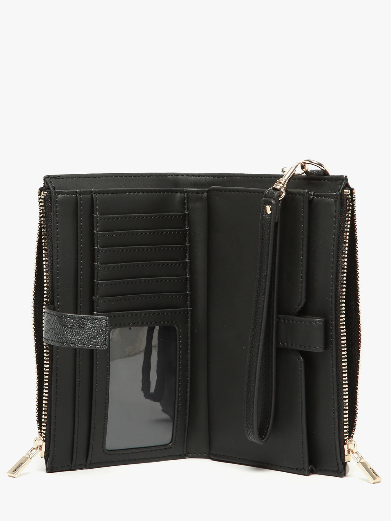 The GUESS wallet, made from P.U material, stands out with its modern design and everyday practicality. Featuring a zip closure combined with a snap button, it offers both security and ease of use. The interior is carefully designed for optimal organization, including three slip pockets for documents, six card slots, one bill compartment, two zippered pockets ideal for coins or small valuables, and one transparent pocket for an ID or photo. Stylish and functional, this wallet suits all looks and perfectly complements both busy days and more dressed-up occasions.
